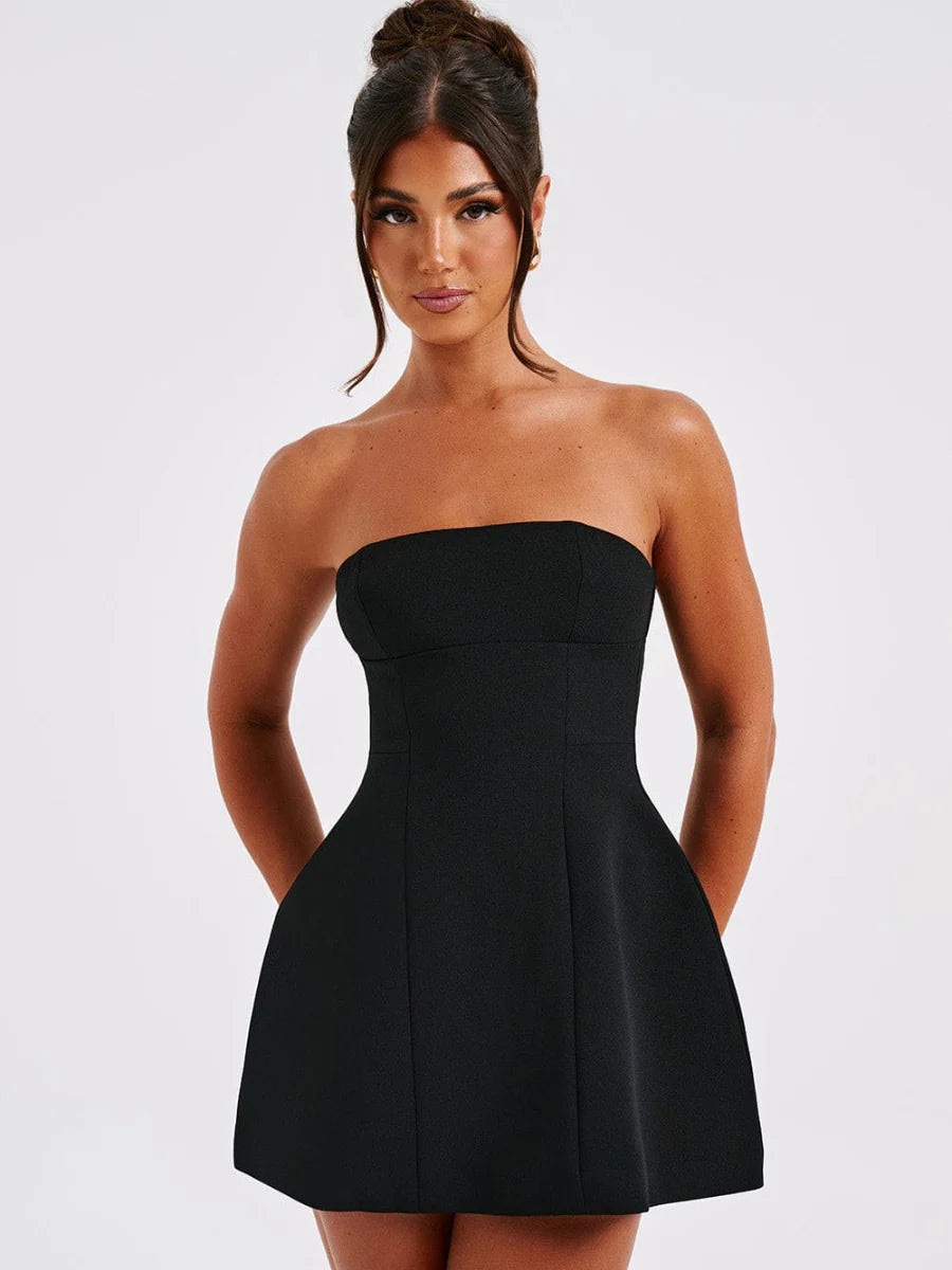 Vestido estructurado de silueta definida. Diseño sin tirantes que realza la figura con un ajuste impecable.