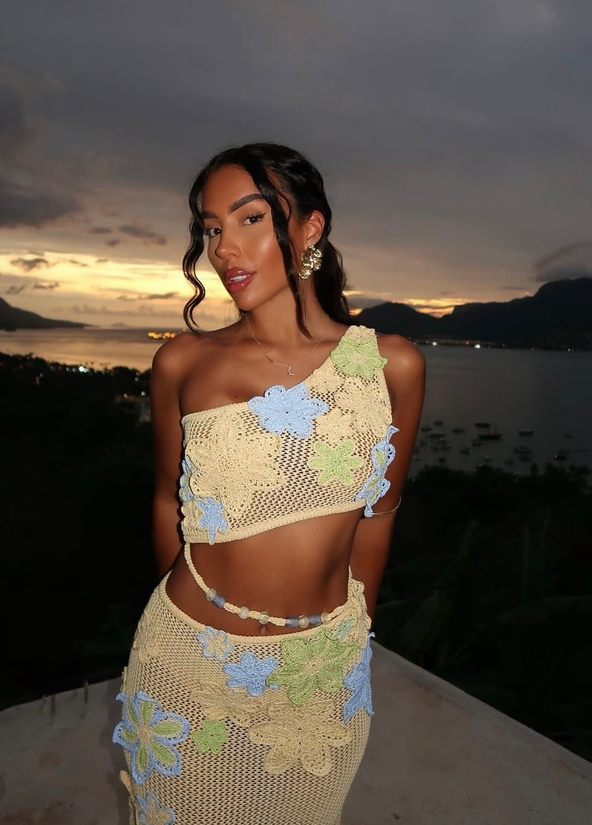 El Conjunto de Playa Venecia combina elegancia y frescura en un diseño perfecto para los días de sol. Compuesto por top tipo bikini y falda larga, crea un look ligero y moderno que realza la silueta con naturalidad.